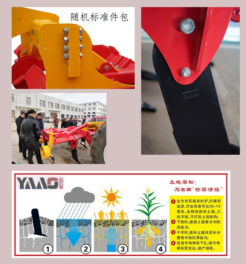 4、使用效益高; 采用原裝進(jìn)口硼鋼深松鏟,具有高強度和超耐磨性,比傳統(tǒng)部件使用壽命提高3-4倍,并利用保險螺栓進(jìn)行過載保護(hù)。使用壽命長