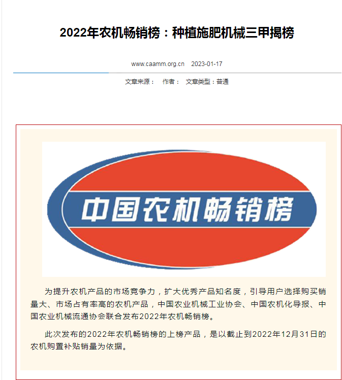 據(jù)中國農機網(wǎng)最新消息,為提升農機產品的市場競爭力,擴大優(yōu)秀產品知名度,引導用戶選擇購買銷量大、市場占有率高的農機產品,中國農業(yè)機械工業(yè)協(xié)會、中國農機化導報、中國農業(yè)機械流通協(xié)會聯(lián)合發(fā)布2022年農機暢銷榜。亞澳農機進入耕整地機械和種植施肥機械農機暢銷雙料三甲榜。