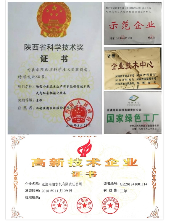 亞澳農(nóng)機(jī)堅持“產(chǎn)品就是人品、內(nèi)在是我心、外在是我臉”的品質(zhì)原則,多功能變速旋耕機(jī)、旋播施肥機(jī)、聯(lián)合耕整機(jī)、雙軸滅茬機(jī)、精量免耕播種機(jī)、深松機(jī)等產(chǎn)品在耕整機(jī)械(主機(jī)配套40-300馬力)領(lǐng)域處于行業(yè)前列, 累計取得自主專利78項。2018年“亞澳”商標(biāo)獲得中國馳名商標(biāo),產(chǎn)品多次被中國農(nóng)機(jī)化協(xié)會、中國農(nóng)業(yè)機(jī)械流通協(xié)會、中國農(nóng)業(yè)機(jī)械工業(yè)協(xié)會授予“AAA級信用企業(yè)”、“技術(shù)進(jìn)步獎”、“產(chǎn)品創(chuàng)新獎”、“全國農(nóng)機(jī)用戶滿意品牌”、“最具影響力品牌”,被國家相關(guān)部委單位授予農(nóng)業(yè)部科技進(jìn)步三等獎、星火計劃金獎、西安市科技進(jìn)步一等獎、陜西省行業(yè)之星企業(yè),“專精特新”中小企業(yè),南陽市級科技百強(qiáng)企業(yè)等多項殊榮;國家型高新技術(shù)企業(yè),在農(nóng)機(jī)行業(yè)中具有較高的美譽(yù)和知名度,得到了社會的廣泛認(rèn)可。