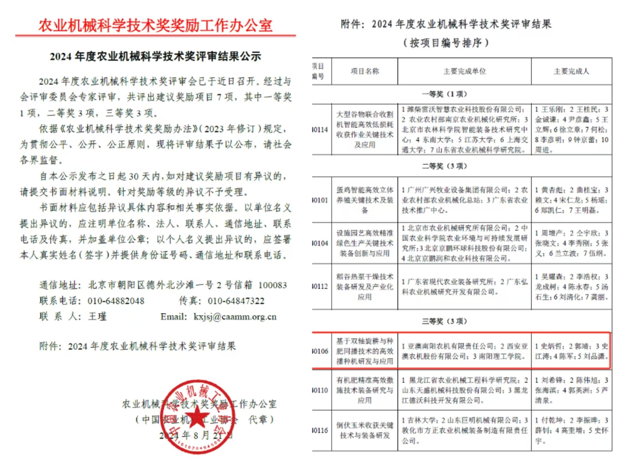 在科技與農(nóng)業(yè)深度融合的時代浪潮中,一則振奮人心的喜訊傳來 ——亞澳農(nóng)機(jī)成功榮獲農(nóng)業(yè)機(jī)械科學(xué)技術(shù)獎!