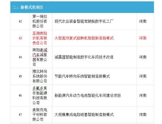 近日,亞澳農(nóng)機被國家工信部評為2017年智能制造綜合標(biāo)準(zhǔn)化與新模式應(yīng)用示范企業(yè)。據(jù)了解,這次全國智能制造綜合標(biāo)準(zhǔn)化專項項目批準(zhǔn)企業(yè)43 家,河南省內(nèi)2家,為機械工業(yè)第六設(shè)計研究院,洛陽軸研科技股份有限公司國有大型企業(yè);新模式應(yīng)用立項51家,河南省僅批準(zhǔn)6家,亞澳智能化制造新模式成為業(yè)界首家,并獲得國家專項資金補貼。