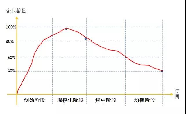 在一個行業(yè),從長期看,企業(yè)要存活下來就要有超出平均水平的成本控制能力。管理學(xué)家陳春花認(rèn)為一個行業(yè)內(nèi)企業(yè)數(shù)量和時間軸之間的關(guān)系可以通過四個發(fā)展階段來說明:初創(chuàng)階段、規(guī)?;A段企業(yè)數(shù)量一直上升,規(guī)模化后期企業(yè)數(shù)量達到頂峰,開始有擠出效應(yīng),約20%企業(yè)出局,到集中階段又有20%企業(yè)出局,到均衡階段還要淘汰20%,最后的競爭就在剩下的40%企業(yè)之間展開。